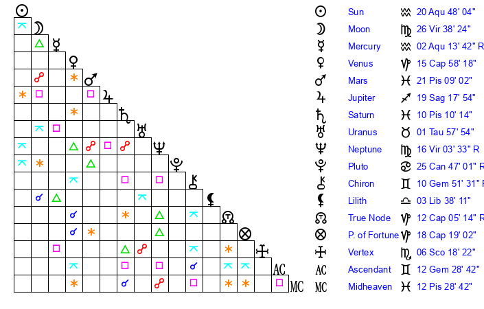 | Sun | 20 Aquarius 47 | 22 Aquarius 12 | 18 Taurus 52 |