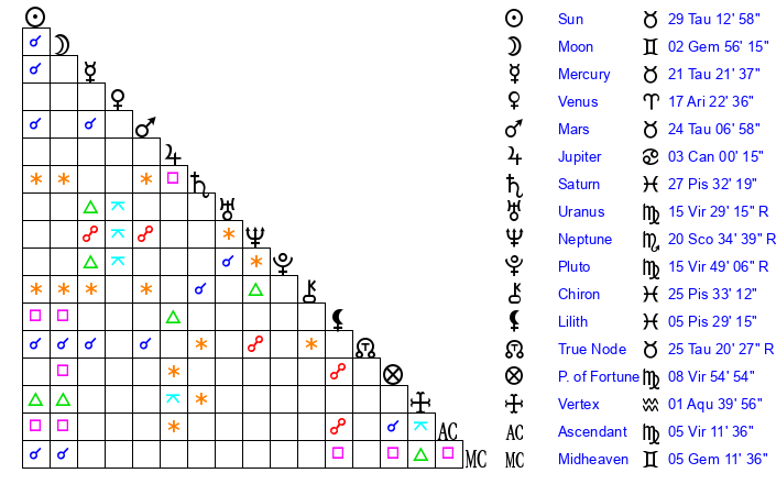 Uranus | 15 Virgo 33 | 27 Taurus 28 | 16 Virgo 53 |