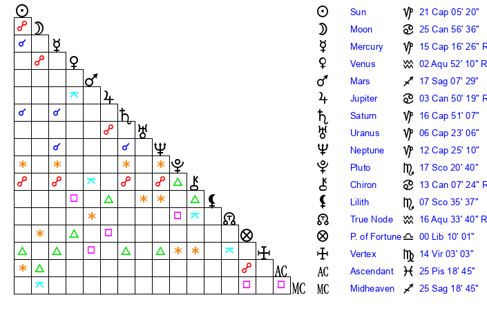 | Mars | 17 Sagittarius 8 | 28 Cancer 1 | 12 Capricorn 19 |