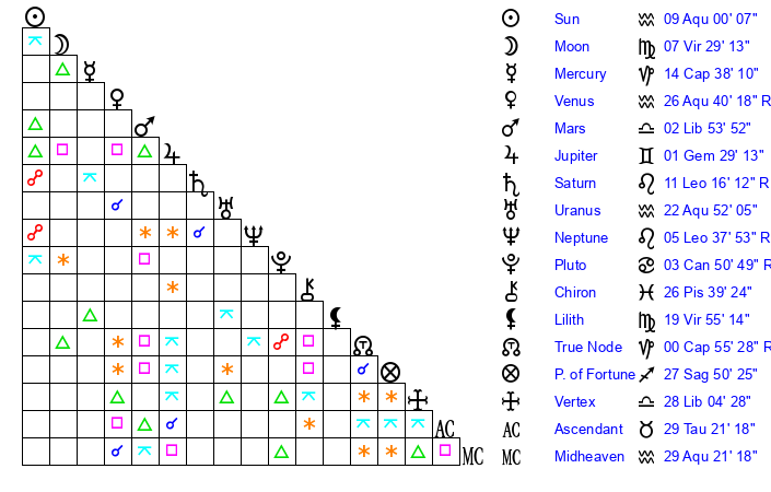 | Moon | 7 Virgo 26 | 12 Aquarius 20 | 12 Leo 17 |