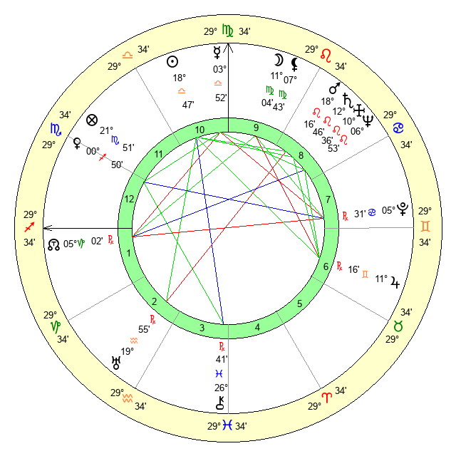 | Moon | 11 Virgo 6 | 5 Cancer 58 | 25 Leo 25 |