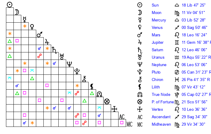 | Sun | 18 Libra 47 | 19 Libra 37 | 7 Aquarius 59 |