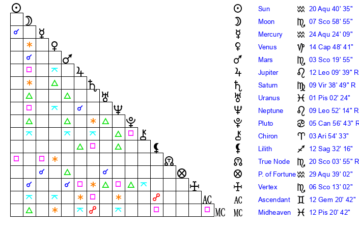 | Sun | 20 Aquarius 40 | 22 Aquarius 12 | 4 Gemini 9 |