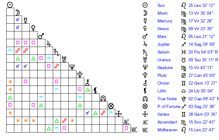 | Sun | 25 Leo 32 | 26 Leo 0 | 23 Scorpio 10 |