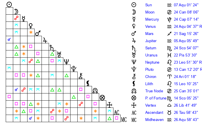 | Saturn | 25 Scorpio 22 | 16 Pisces 54 | 23 Scorpio 53 |