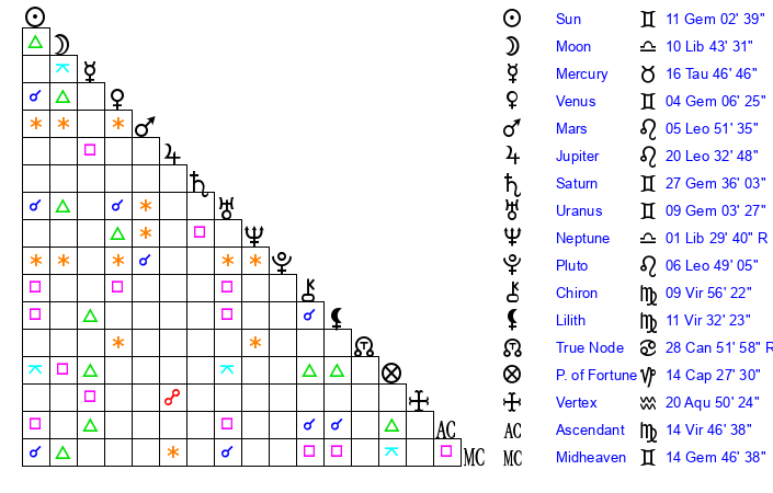 | Saturn | 27 Gemini 55 | 0 Aries 26 | 7 Cancer 48 |