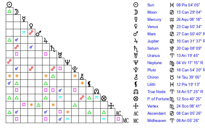 | Sun | 8 Pisces 54 | 10 Pisces 6 | 10 Gemini 57 |