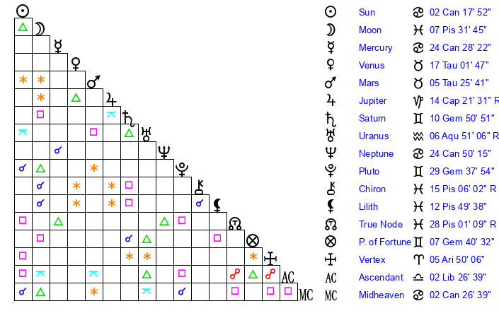 | Neptune | 24 Cancer 51 | 2 Aries 8 | 28 Cancer 9 |