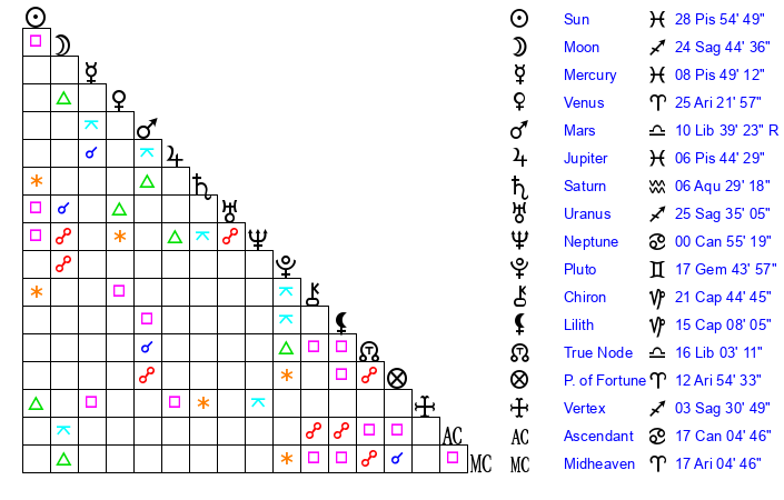 | Neptune | 0 Cancer 56 | 29 Pisces 37 | 4 Cancer 19 |