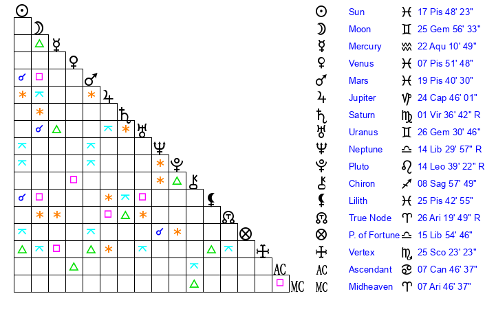| Sun | 17 Pisces 48 | 18 Pisces 22 | 2 Gemini 13 |
