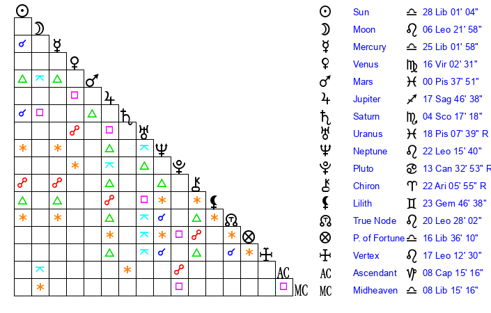 | Neptune | 22 Leo 15 | 0 Aries 0 | 21 Leo 30 |