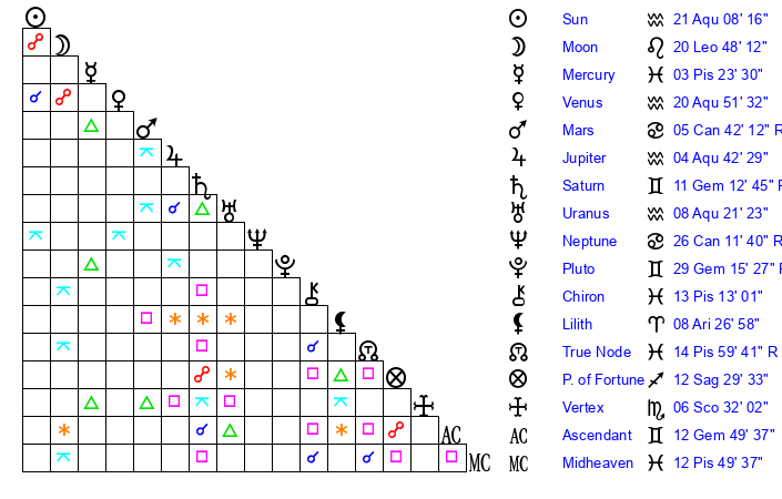 | Sun | 21 Aquarius 8 | 22 Aquarius 12 | 10 Gemini 20 |