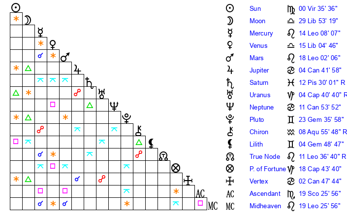 | Mercury | 14 Leo 8 | 14 Leo 36 | 7 Sagittarius 41 |