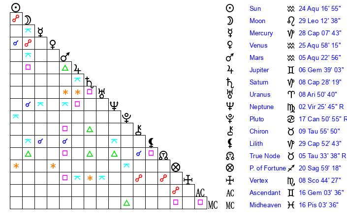 | Sun | 24 Aquarius 17 | 25 Aquarius 15 | 27 Taurus 58 |