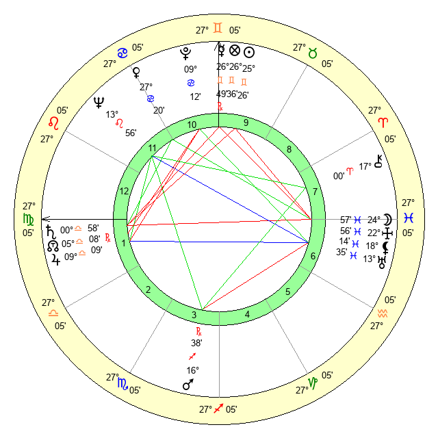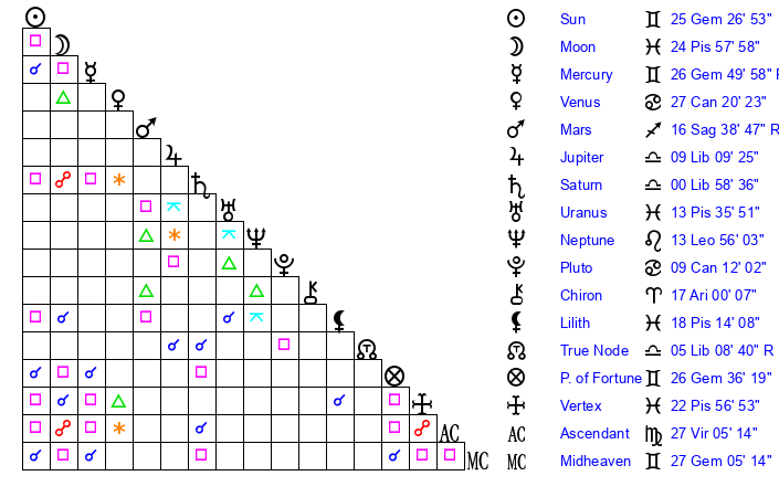 | Sun | 25 Gemini 27 | 26 Gemini 31 | 4 Libra 32 |