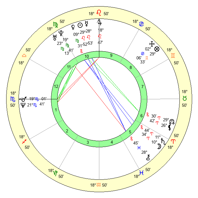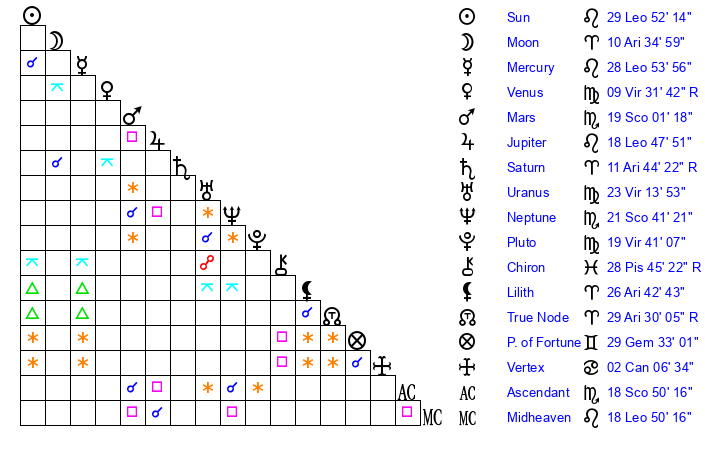 Mercury | 28 Leo 55 | 13 Leo 10 | 17 Scorpio 19 |