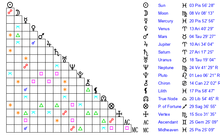 | Sun | 3 Pisces 56 | 5 Pisces 20 | 27 Taurus 34 |
