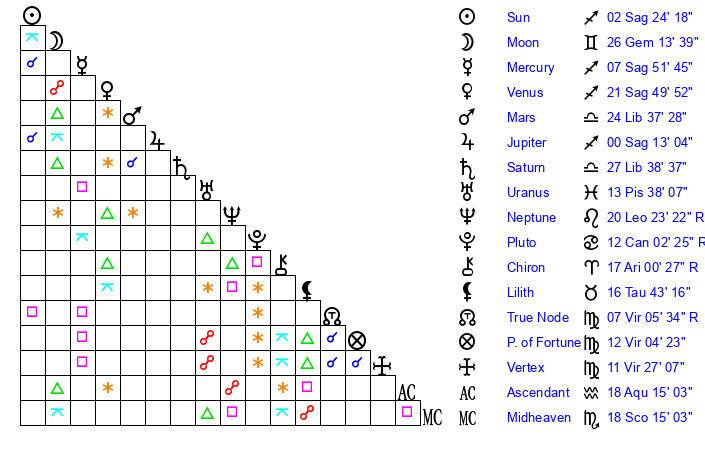 | Moon | 26 Gemini 18 | 2 Libra 48 | 15 Pisces 16 |