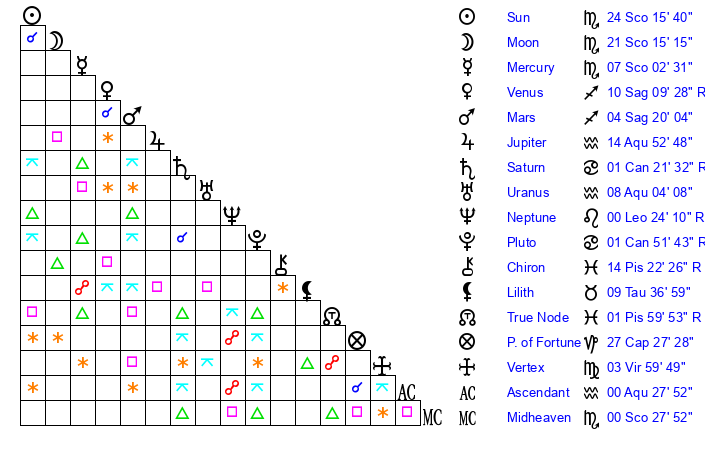 | Sun | 24 Scorpio 15 | 25 Scorpio 35 | 15 Pisces 48 |