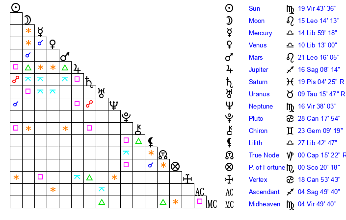 | Sun | 19 Virgo 43 | 20 Virgo 11 | 18 Sagittarius 29 |