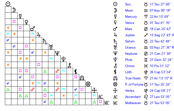 Sun | 17 Taurus 28 | 18 Taurus 6 | 5 Virgo 43 |