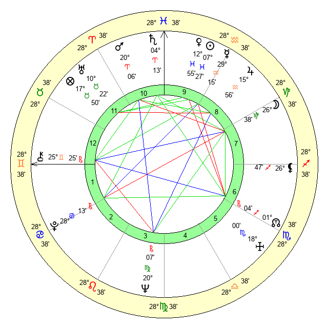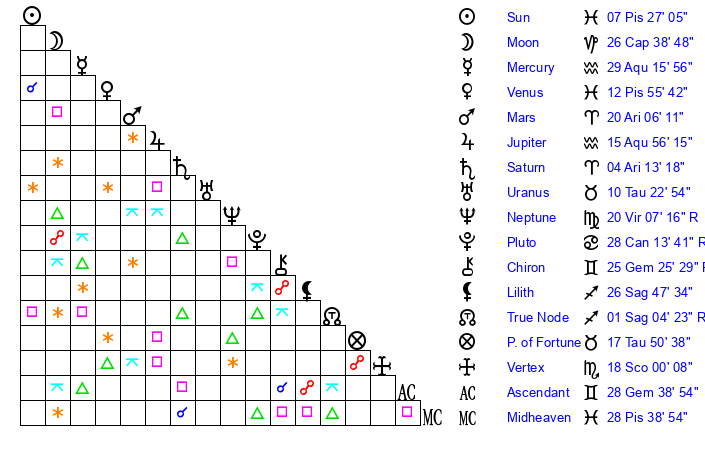 | Sun | 7 Pisces 27 | 8 Pisces 21 | 2 Gemini 51 |