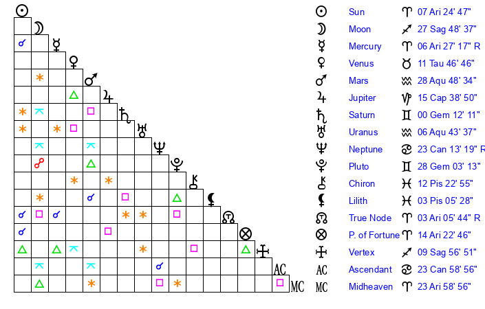 Neptune | 23 Cancer 13 | 29 Pisces 56 | 25 Cancer 43 |