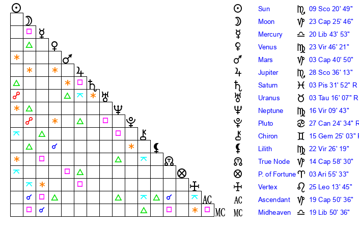 | Neptune | 16 Virgo 9 | 29 Pisces 44 | 16 Virgo 16 |