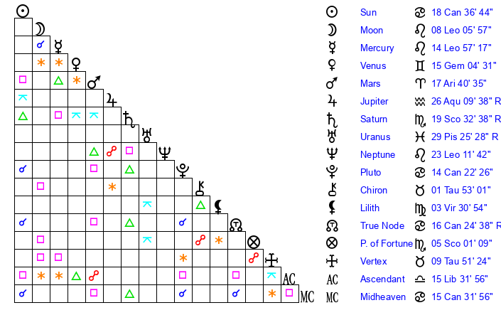 | Pluto | 14 Cancer 23 | 2 Aquarius 53 | 15 Cancer 57 |
