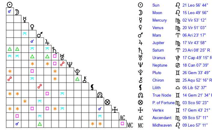 | Moon | 15 Leo 43 | 12 Taurus 42 | 8 Scorpio 50 |
