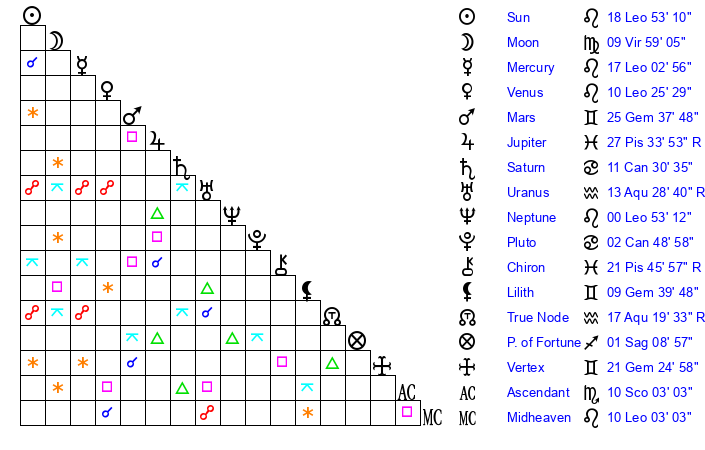 | Sun | 18 Leo 53 | 20 Leo 14 | 7 Sagittarius 25 |