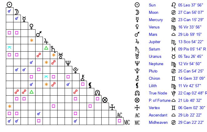 | Pluto | 25 Cancer 54 | 2 Aquarius 28 | 27 Cancer 24 |