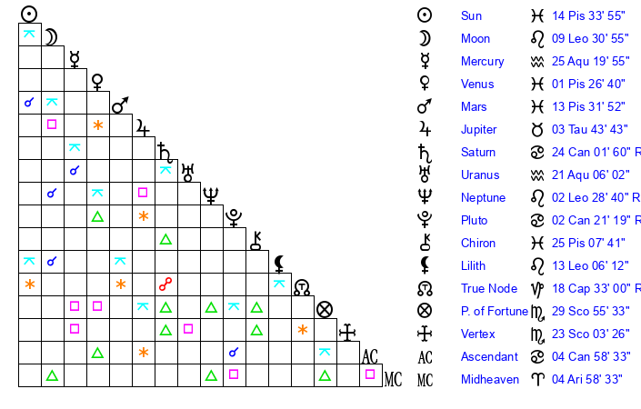 | Sun | 14 Pisces 34 | 15 Pisces 22 | 29 Gemini 42 |