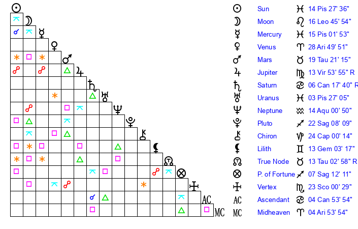 Sun | 14 Pisces 28 | 14 Pisces 22 | 5 Aries 23 |