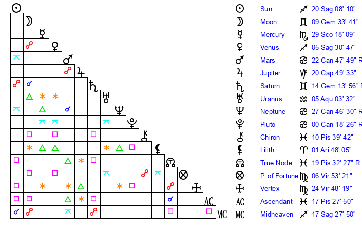| Venus | 5 Sagittarius 31 | 14 Sagittarius 59 | 25 Aries 44 |