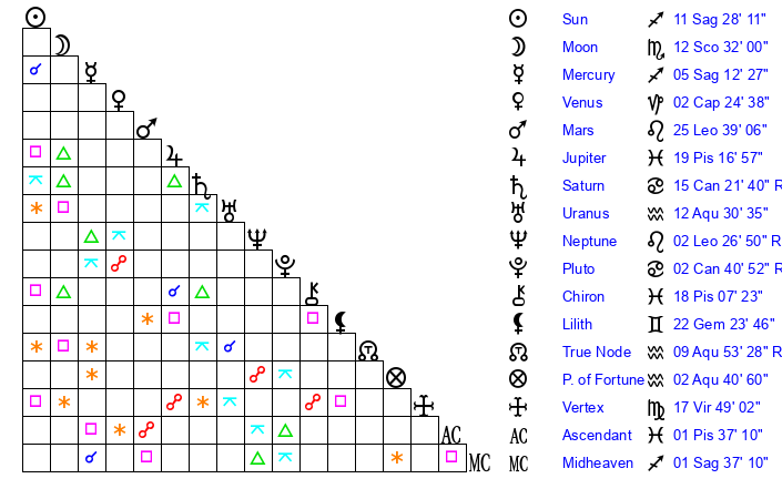 | Moon | 12 Scorpio 33 | 23 Capricorn 45 | 9 Scorpio 36 |