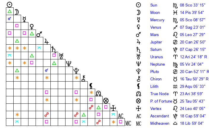 | Moon | 14 Pisces 45 | 16 Pisces 41 | 8 Virgo 40 |