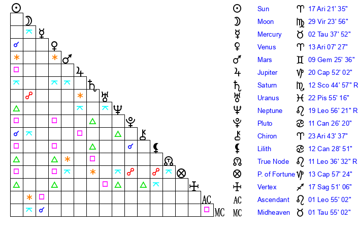 | Sun | 17 Aries 21 | 18 Aries 7 | 23 Cancer 37 |
