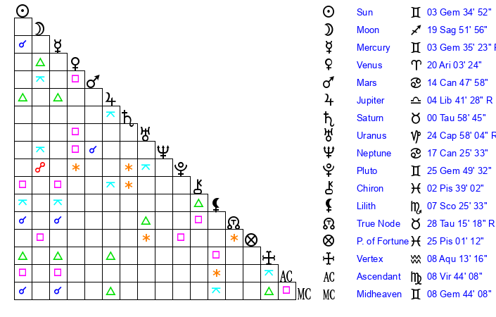 | Moon | 19 Sagittarius 57 | 14 Taurus 43 | 3 Pisces 54 |
