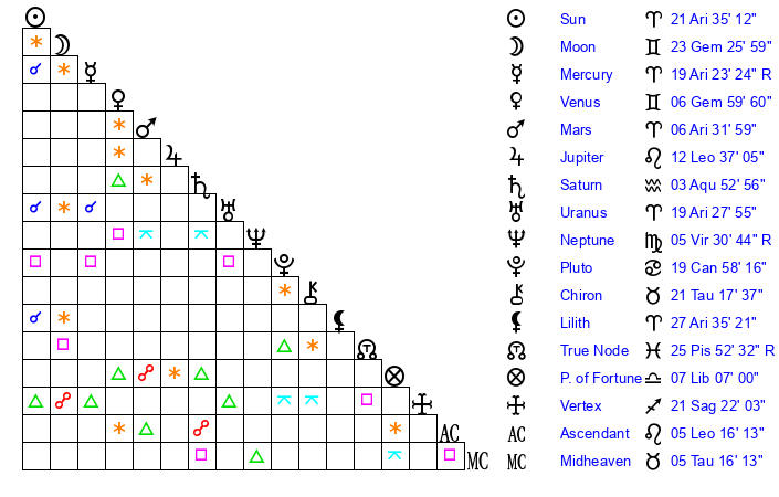 | Venus | 7 Gemini 0 | 24 Pisces 40 | 29 Gemini 55 |