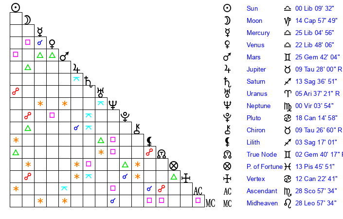 | Moon | 14 Capricorn 56 | 18 Libra 55 | 13 Leo 53 |