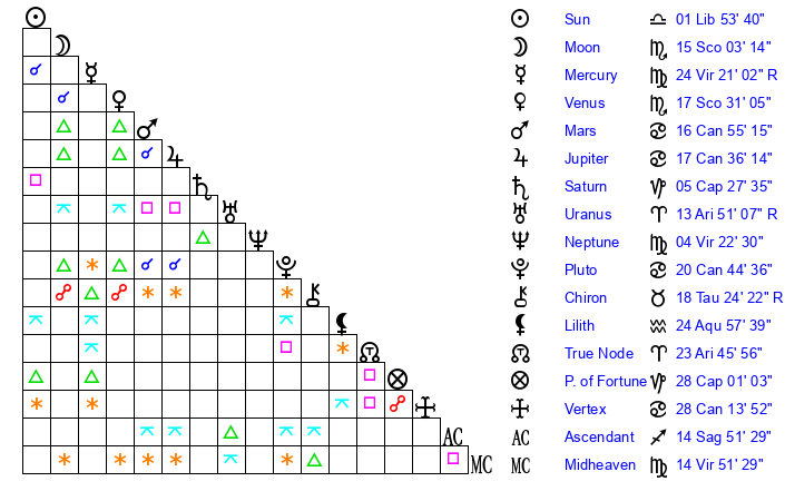 | Venus | 17 Scorpio 31 | 7 Virgo 34 | 26 Scorpio 53 |