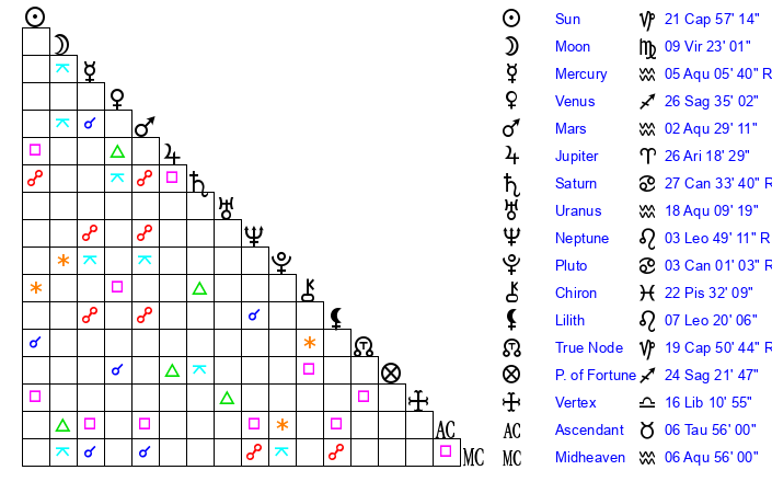 | Uranus | 18 Aquarius 6 | 23 Taurus 25 | 23 Aquarius 20 |