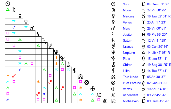 | Moon | 28 Virgo 1 | 29 Taurus 50 | 29 Gemini 12 |