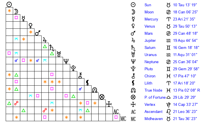 | Moon | 18 Cancer 7 | 2 Cancer 12 | 12 Leo 40 |