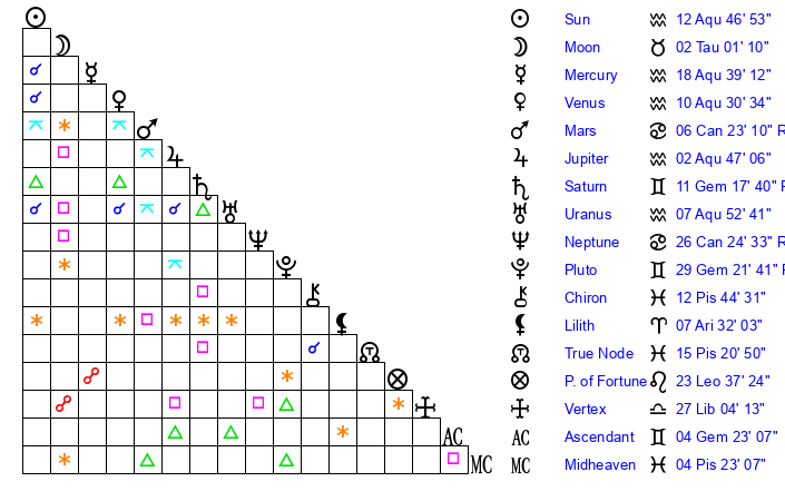 | Sun | 12 Aquarius 46 | 13 Aquarius 51 | 2 Gemini 25 |
