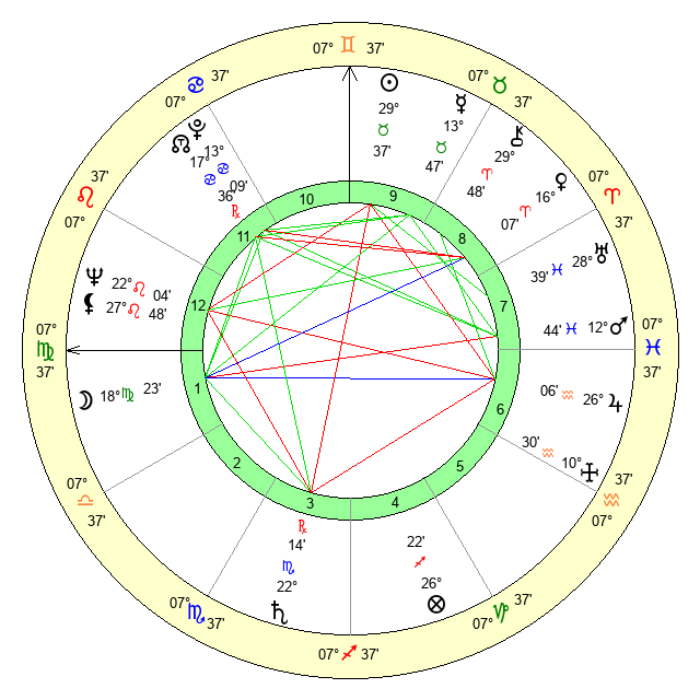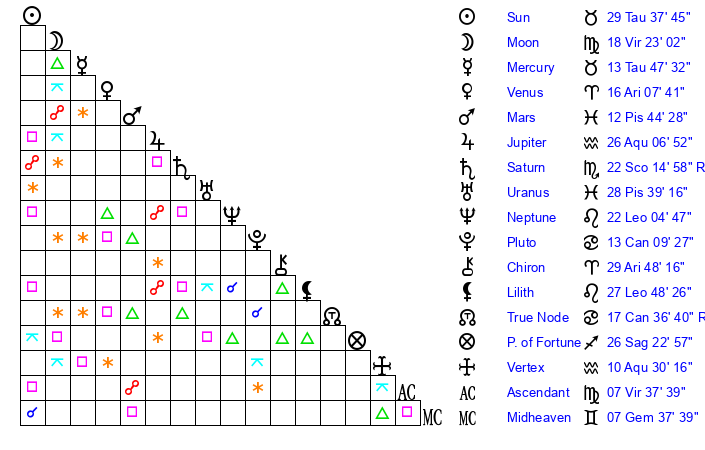 | Moon | 18 Virgo 15 | 12 Pisces 43 | 12 Taurus 40 |