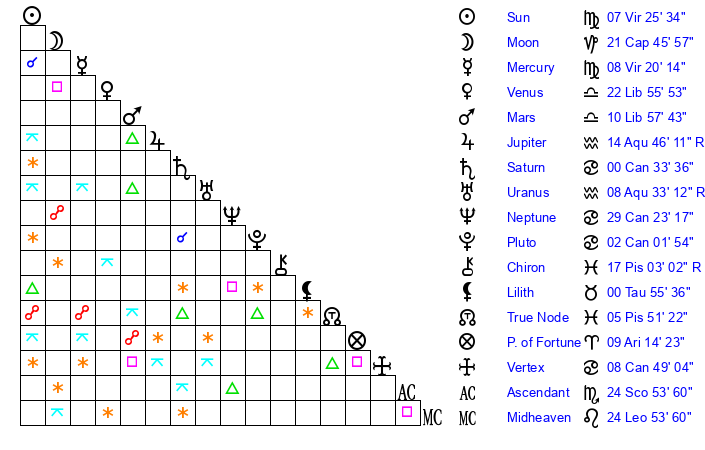 | Sun | 7 Virgo 25 | 8 Virgo 32 | 27 Sagittarius 59 |