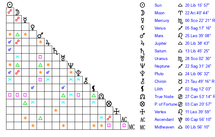 | Saturn | 14 Libra 7 | 26 Pisces 44 | 19 Libra 6 |