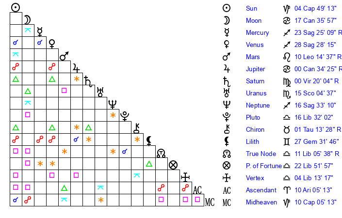 | Neptune | 16 Sagittarius 33 | 27 Pisces 13 | 17 Sagittarius 56 |